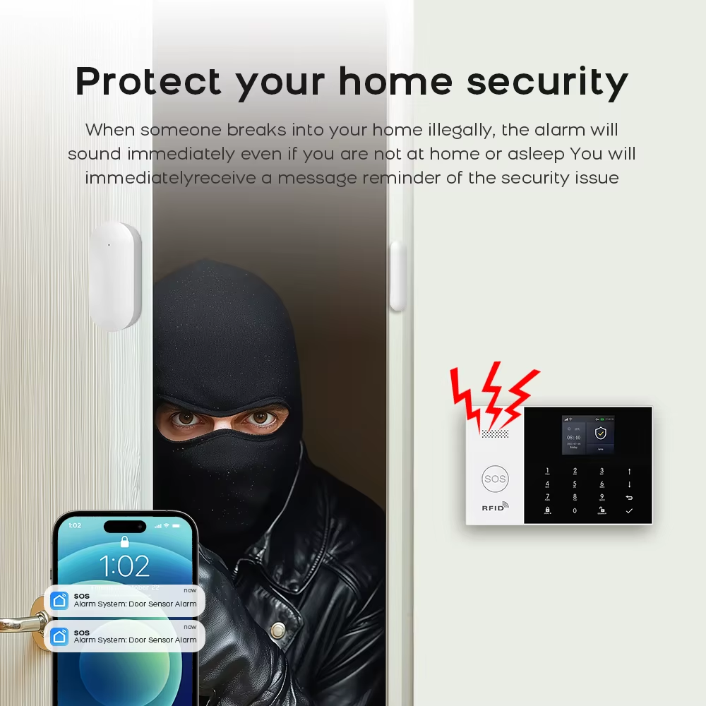Tu seguridad no se detiene. El panel central cuenta con una batería de respaldo interna que lo mantiene operativo durante varias horas si hay un corte eléctrico. Además, el sistema es híbrido (WiFi + GSM): si el internet falla, puedes insertar una tarjeta SIM de cualquier operador y la alarma te enviará mensajes SMS o te llamará directamente a tu teléfono si ocurre una intrusión.